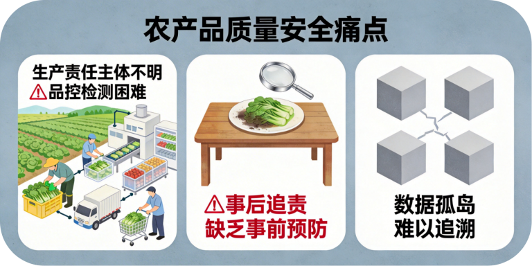 农产品质量安全备受关注,市场急需实现“从农田到餐桌”的全程质量控制,解决生产责任主体不明、品控检测困难等问题。